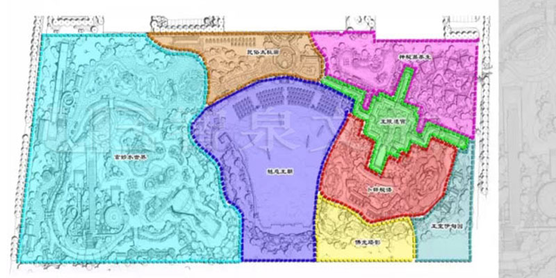 策划思路:室外温泉整体按照太极图进行布局,动静分区。动区以水游乐为核心,配套民俗体验项目;静区以周易养生为核心,结合王室爱情、药浴养生等产品。室外温泉为游客提供玩温泉、悟周易、品爱情、聊人生、赏美景的室外温泉乐园。